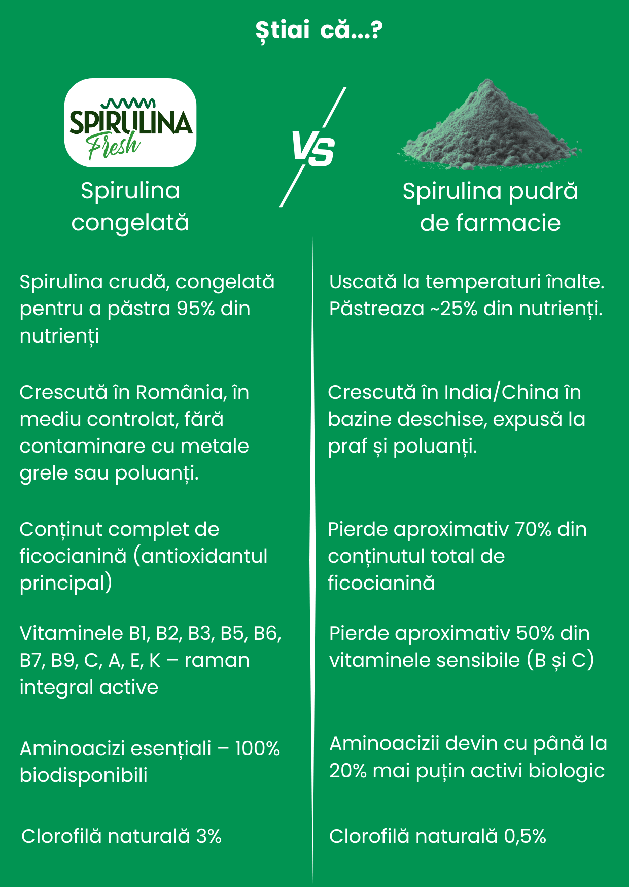 Spirulina 100% pură, cultivată în apă dulce cu minerale naturale, fără aditivi, conservanți sau coloranți, produsă în România.